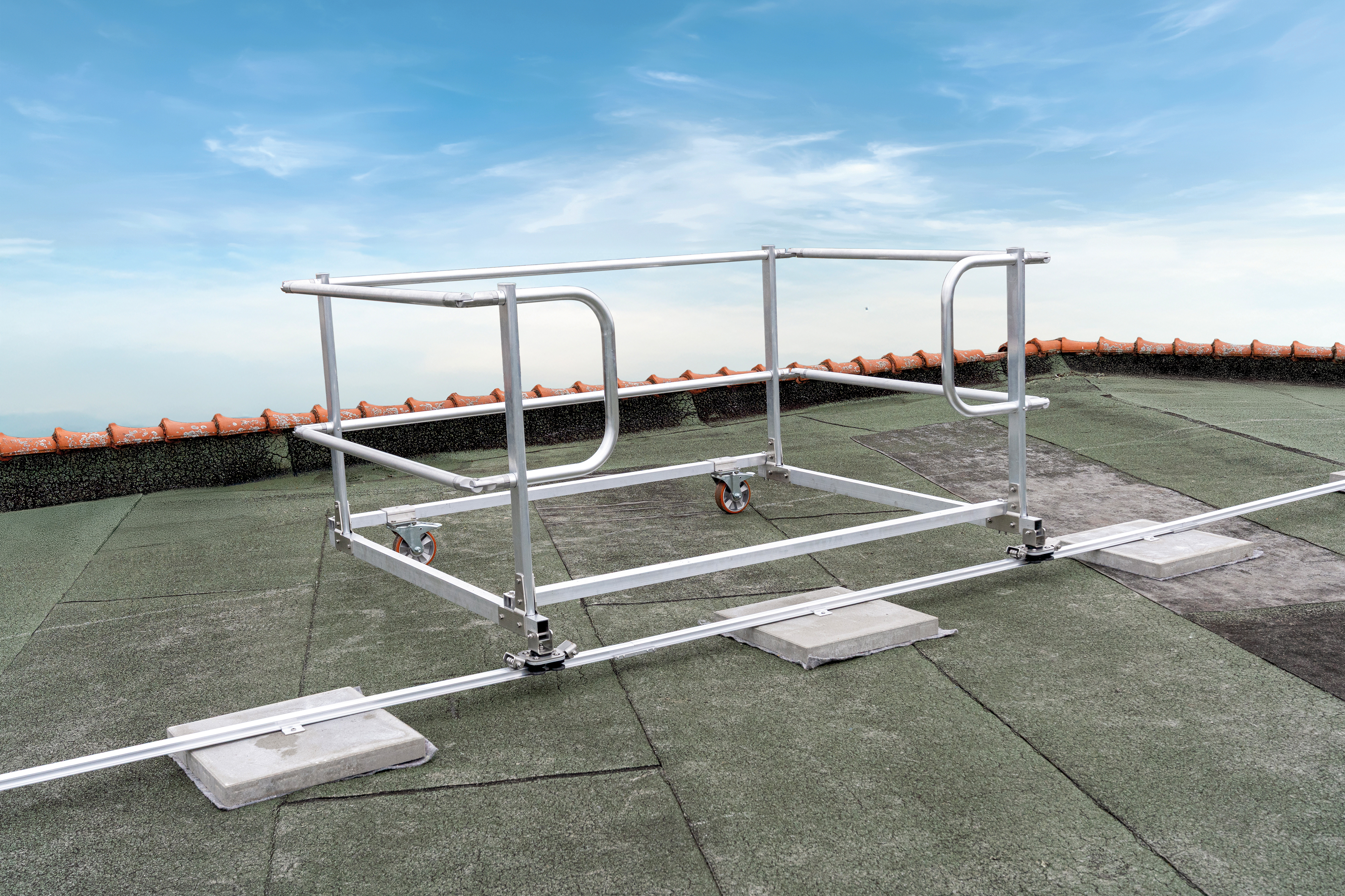 Die fahrbare Einheit entspricht der Norm DIN EN 13374:2019 – Klasse A und bietet somit höchste Sicherheit bei temporären Arbeiten auf dem Flachdach.