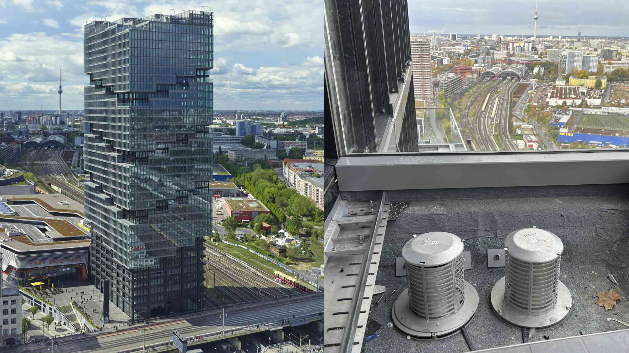 Maßgeschneiderte Lösungen von Loro für den EDGE EastSide Tower in Berlin. Das Hochhaus der Architekten von BIG Bjarke Ingels Group forderte bei 140 Metern Höhe und versetzt angeordneten Versprüngen clevere Ideen für eine raumsparende, kaskadierende Entwässerung.