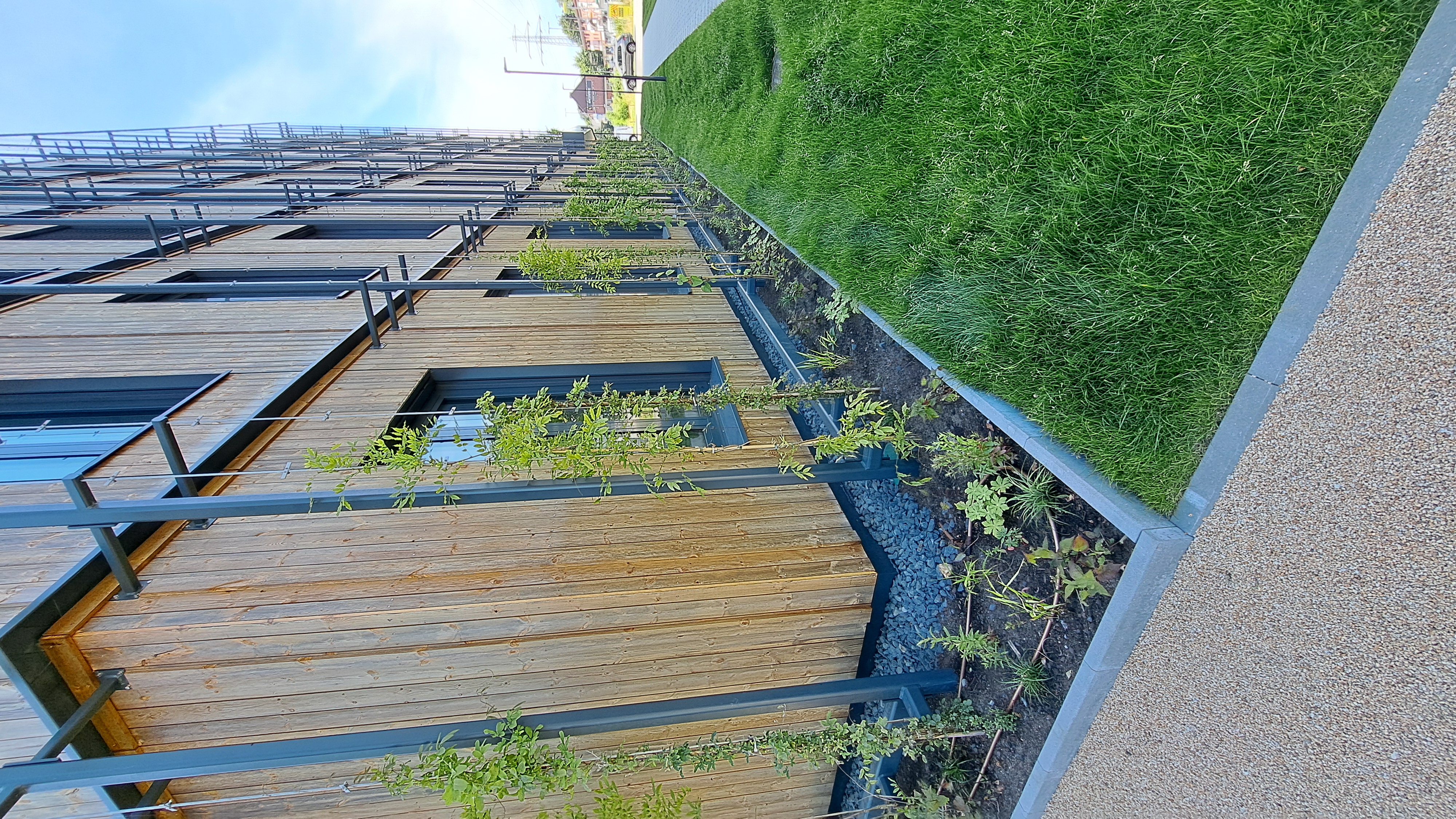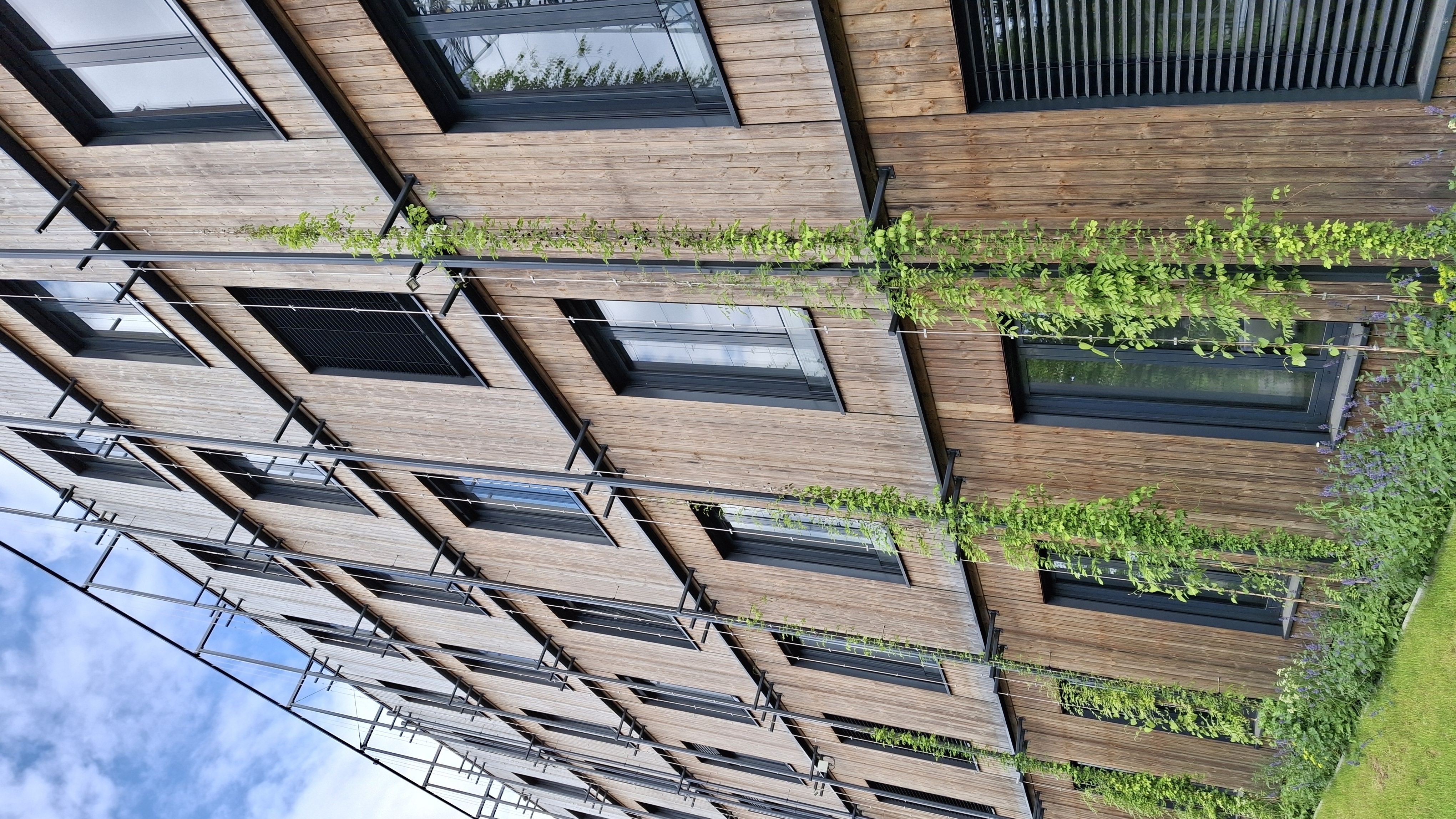 Holzfassade in Gebäudeklasse 5 mit integrierter Begrünung