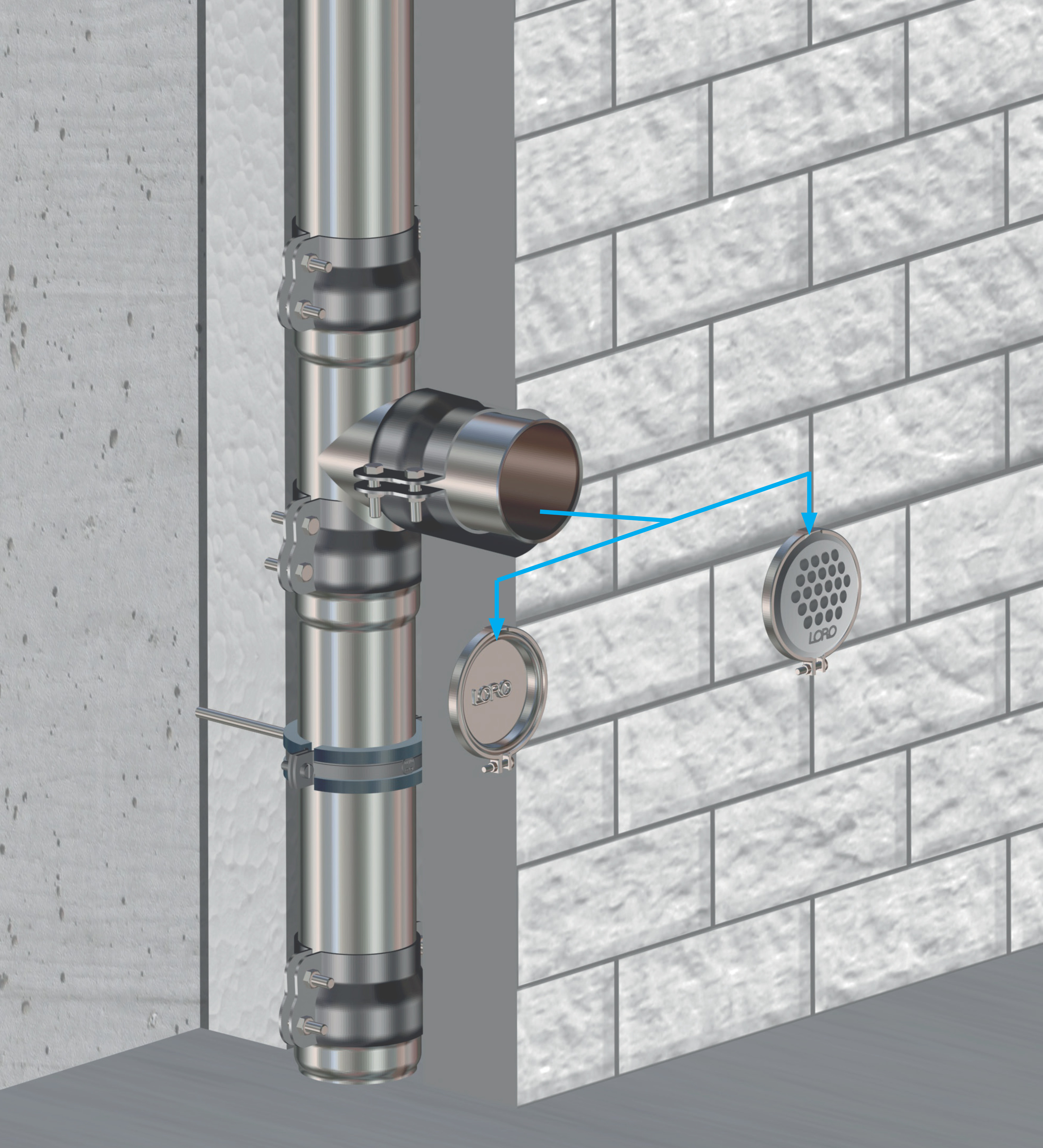 Um nun die Revisionsöffnung aus dem Inneren nach außen an die Fassade zu führen, sind Rohrstutzen konzipiert. Sie lassen sich einfach auf die Revisionsöffnung in der Fallleitung setzen. Dafür wird ein Loro-X 90-Grad-Abzweig anstelle des Standrohrs montiert und der Zugang zum Fallrohr so über den Stutzen nach außen verlegt. Er lässt sich bauseits kürzen, sodass er bündig mit der Fassade abschließt. Reinigungsdeckel oder HSÜ schließen den Stutzen nach außen ab.