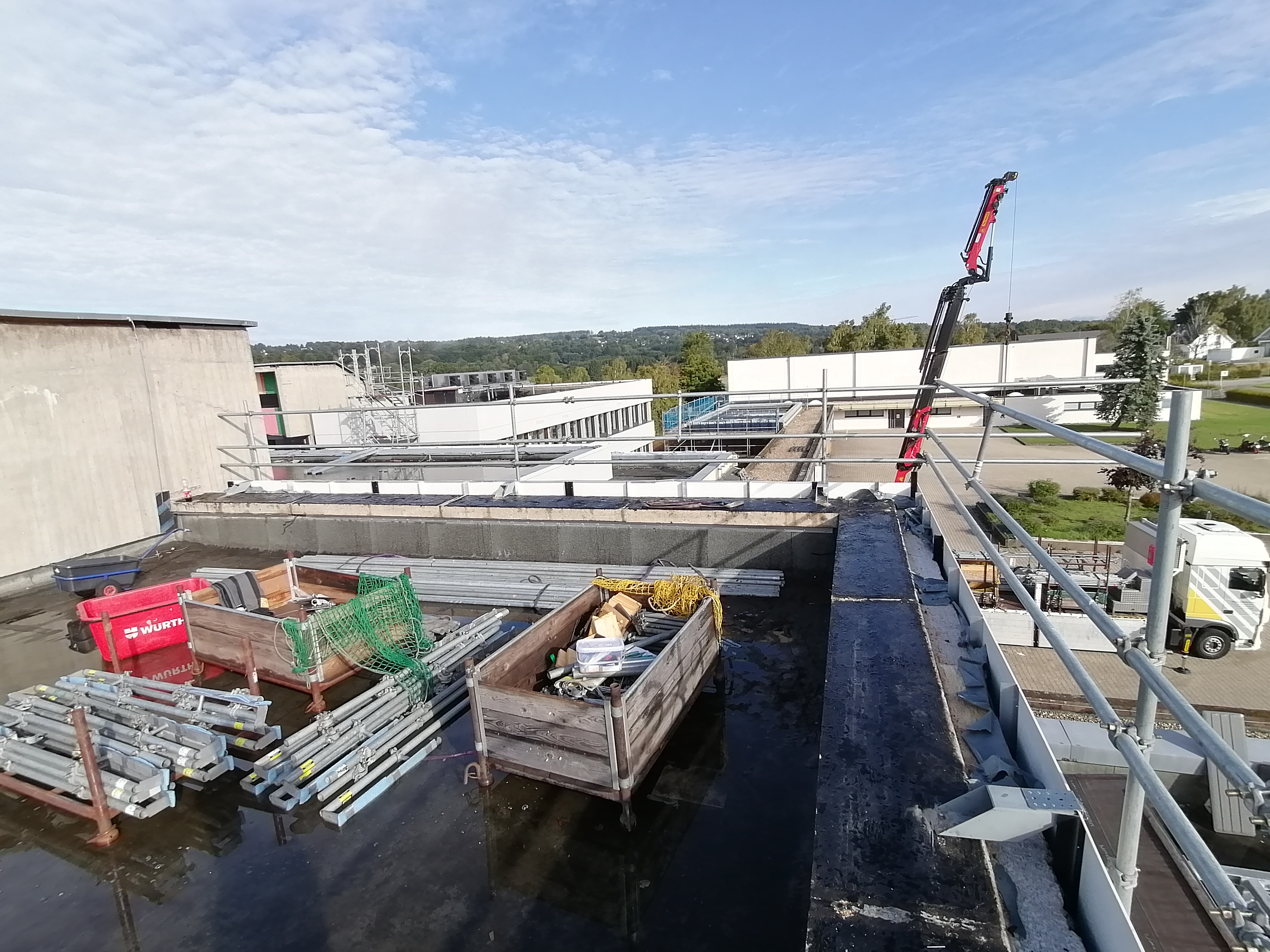 Im Jahr 2025 begann die Stadt Monschau mit der Einrichtung der Baustelle für die Dacharbeiten. Der alte Dachaufbau verfügte über eine langlebige 10 cm dicke Foamglas-Kompaktdachlage, die mit der Dachhaut verschweißt wurde. Den Abschluss bildete eine Betondecke. Die energetische Dachsanierung der insgesamt ca. 2.600 Quadratmeter großen Dachfläche beinhaltete die Herstellung eines komplett neuen Dachaufbaus nach geltender EnEV mit der Tragfähigkeit als Warmdachkonstruktion und entsprechenden Aufbauten und Systemen für Entwässerung, Technik, Wärmepumpe und aufgeständerter Photovoltaikanlage.