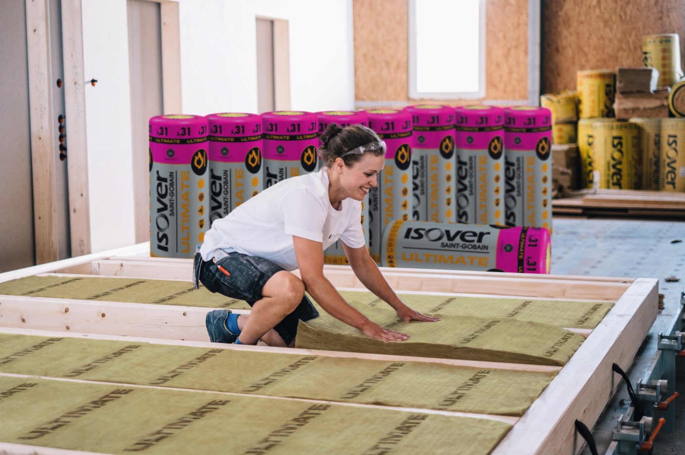 Durch die Kombination des natürlichen Wertstoffes Holz mit hochleistungsfähigen Dämmstoffen wie der ULTIMATE Hochleistungs-Mineralwolle von ISOVER entstehen Konstruktionen, die in Sachen Wärme-, Brand- und Schallschutz keinerlei Kompromisse eingehen müssen.