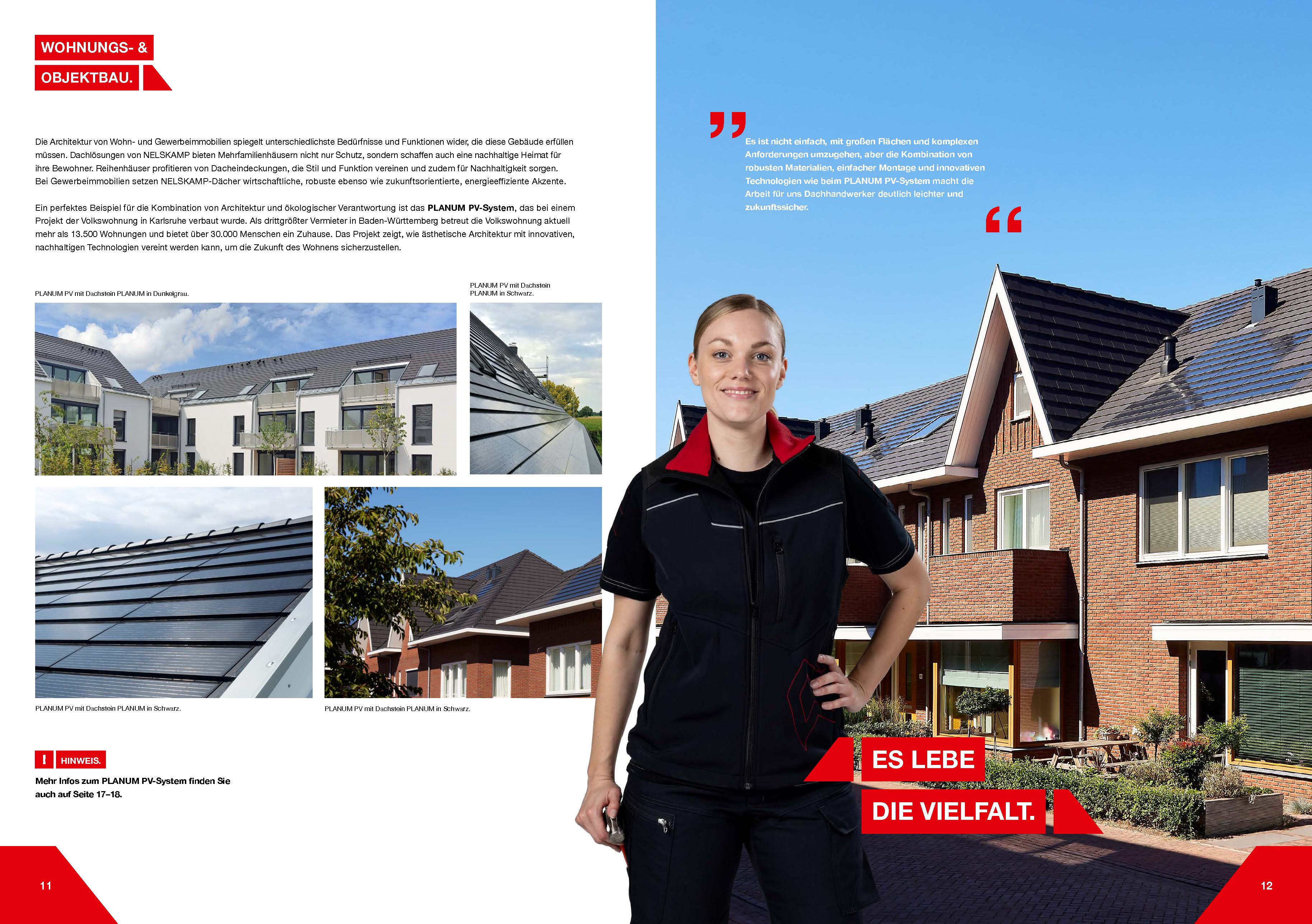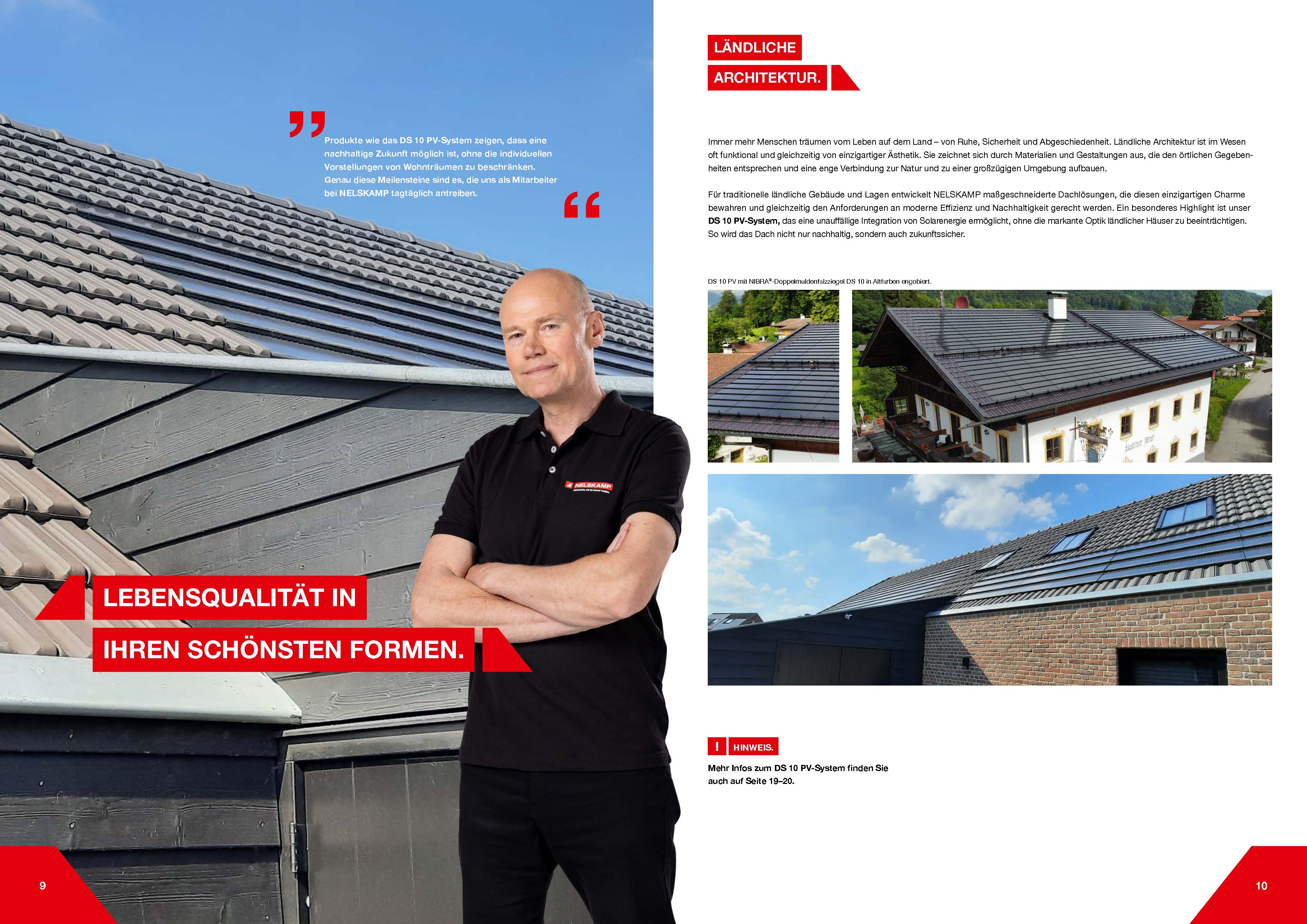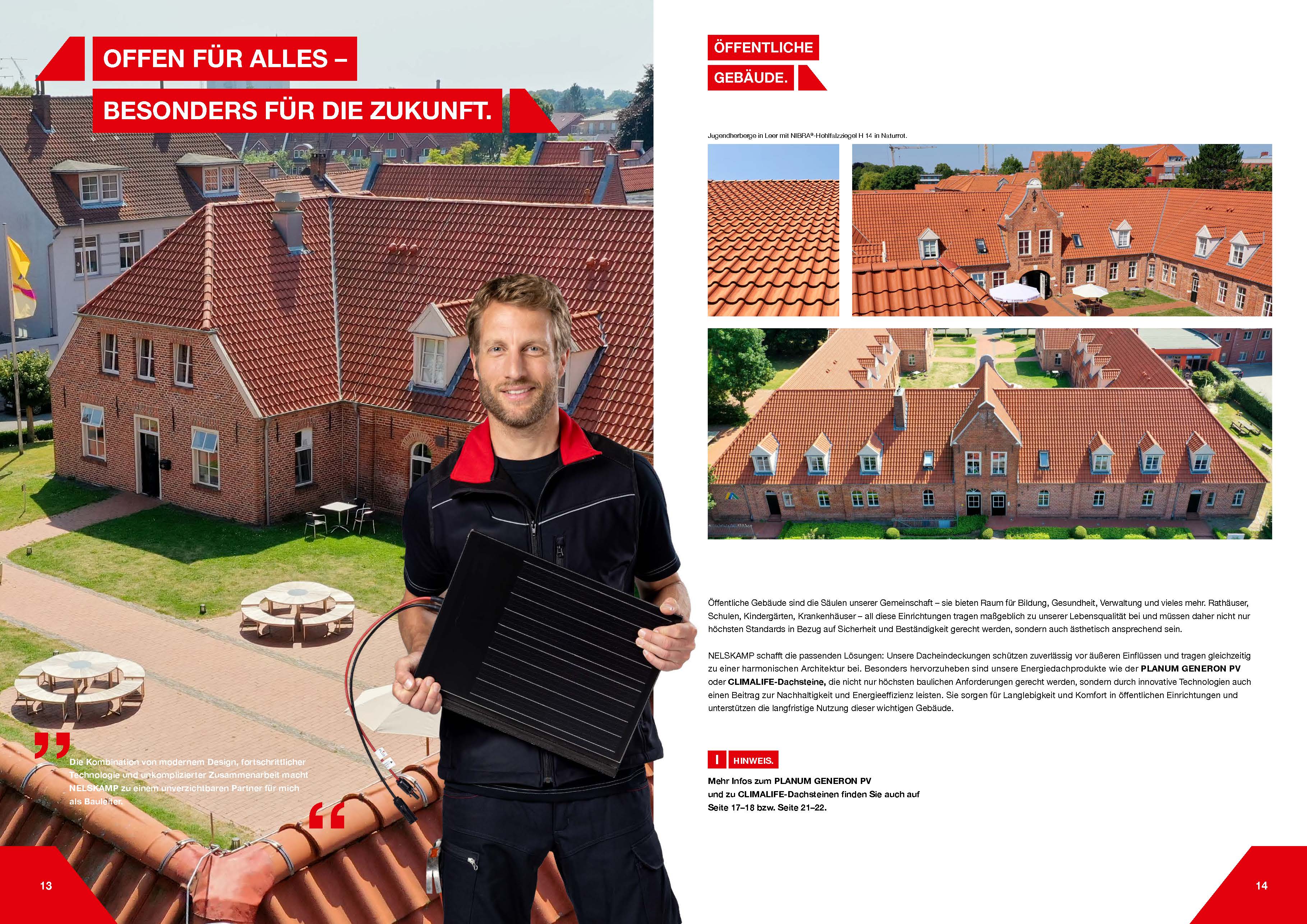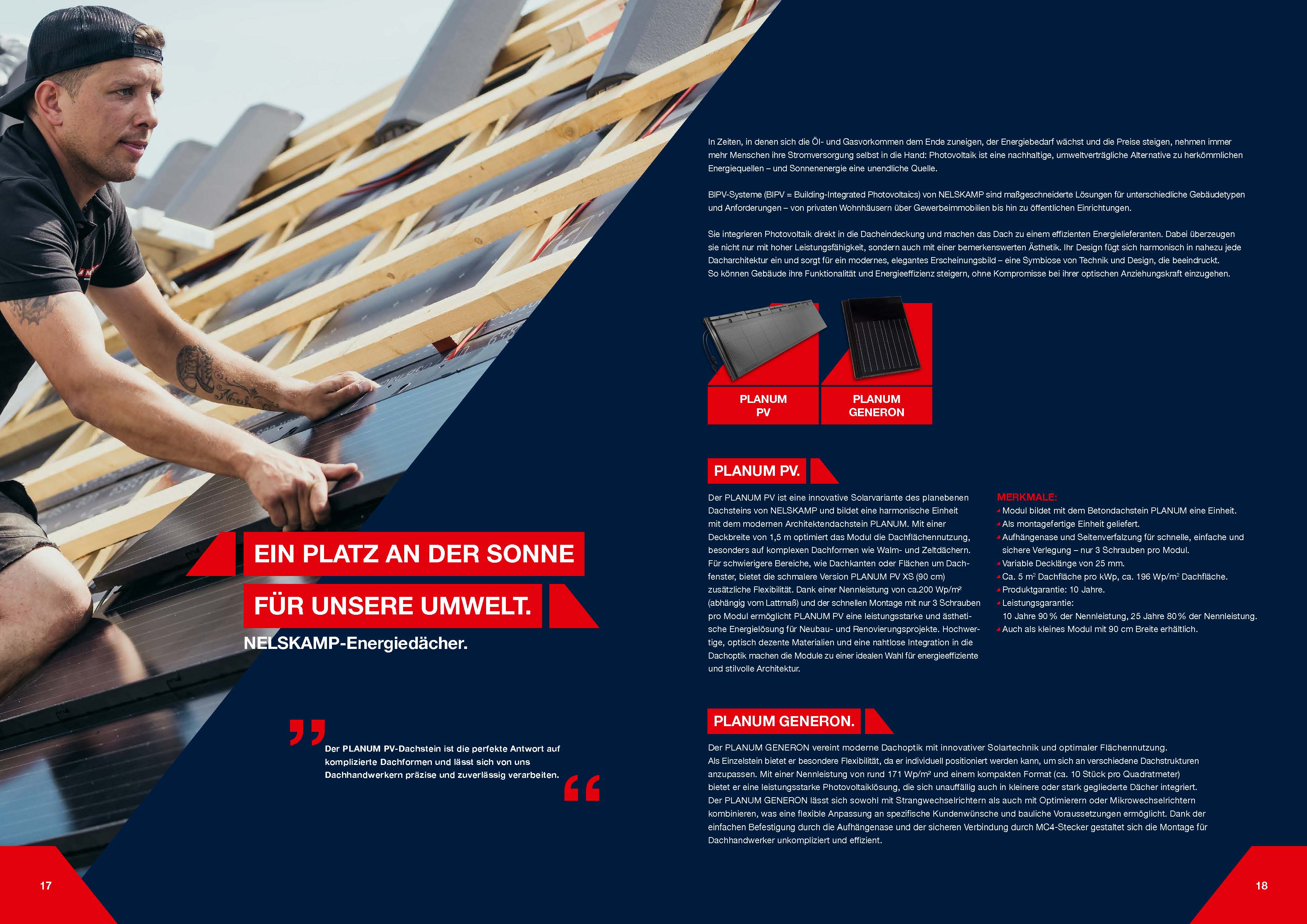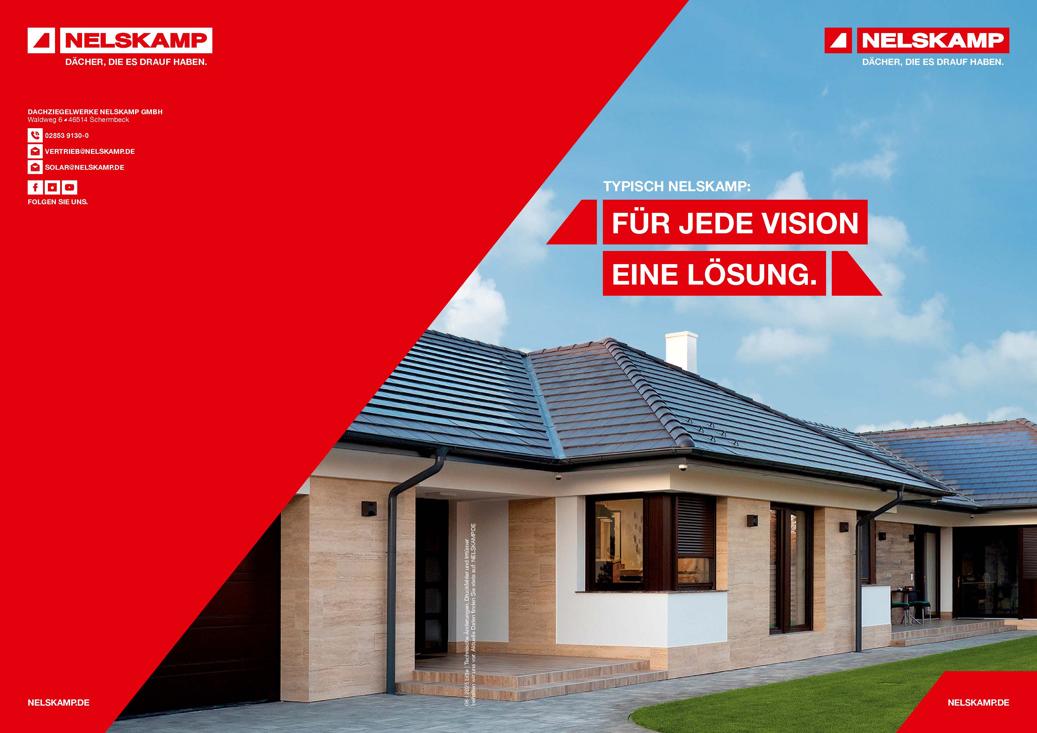 Besides clay and concrete roof tiles, Nelskamp's product range includes the entire spectrum of photovoltaic systems: on-roof PV systems, in-roof PV, and the pioneering Building Integrated PV (BIPV solar tiles), where the photovoltaic elements form a complete roof covering. Nelskamp solar tiles are already available for ten different models and various formats for optimal use of roof space. Red solar tiles are the latest innovation, harmonizing technology, tradition, and aesthetics with the demands of the 21st century, even for red roofs, including those on heritage protected buildings.