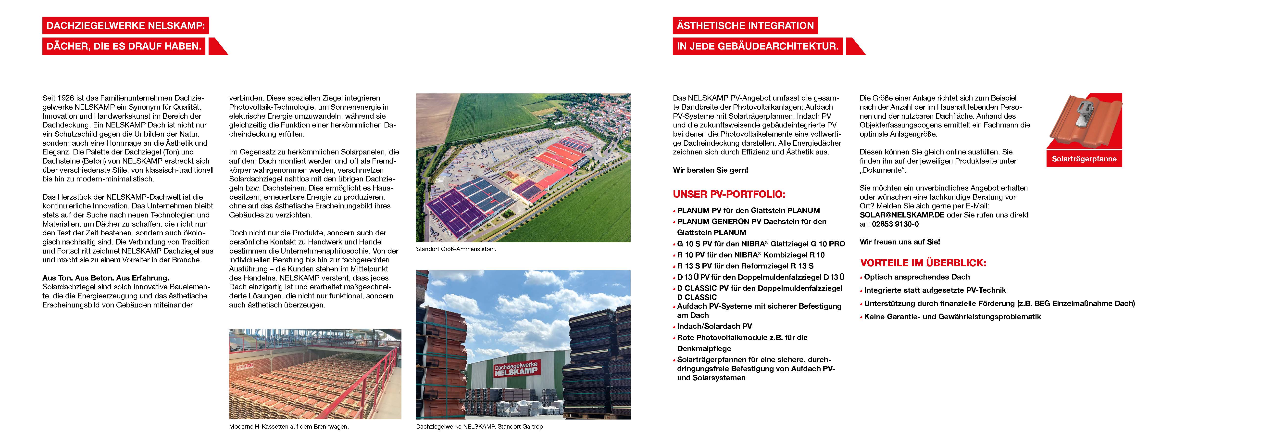 Nelskamp's PV product range includes the entire spectrum of photovoltaic systems: on-roof PV systems, in-roof PV, and the pioneering Building Integrated PV (BIPV solar tiles), where the photovoltaic elements form a complete roof covering. Nelskamp solar tiles are already available for ten different models and various formats for optimal use of roof space. Red solar tiles are the latest innovation, harmonizing technology, tradition, and aesthetics with the demands of the 21st century, even for red roofs, including those on heritage protected buildings.